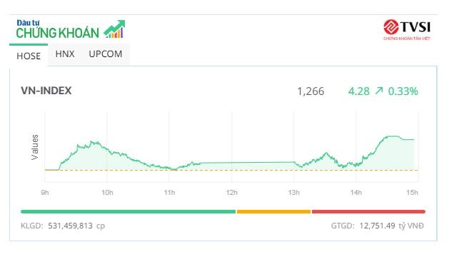 Đóng cửa, sàn HOSE 245 mã tăng và 130 mã giảm, VN-Index tăng 4,28 điểm (+0,34%) lên 1.266 điểm. Tổng khối lượng giao dịch đạt gần 531,5 triệu đơn vị, giá trị 12.751,5 tỷ đồng, cùng tăng hơn 5% cả về khối lượng và giá trị so với phiên hôm qua. Giao dịch thỏa thuận đóng góp 139,58 triệu đơn vị, giá trị 3.907,6 tỷ đồng.
