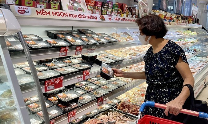 Người tiêu dùng mua sắm thịt có thương hiệu Việt tại một siêu thị, tháng 10/2023. Ảnh: DNCC