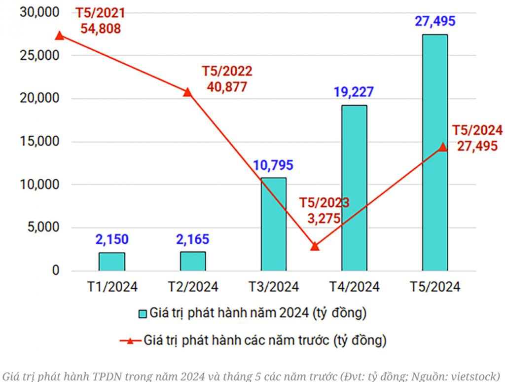 Lũy kế từ đầu năm 2024, ước tính có hơn 67 nghìn tỷ đồng TPDN được phát hành mới, tăng 93% so với cùng kỳ năm trước. Trong đó, các đợt phát hành được đón nhận tập trung TPDN riêng lẻ, không tài sản đảm bảo, bên cạnh số ít các đợt phát hành TPDN ra công chúng.