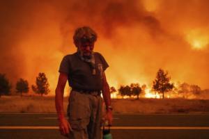 Ông Grant Douglas dừng lại trong khi sơ tán khỏi đám cháy bùng phát trên...