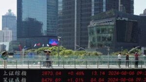 Màn hình hiển thị thông tin chứng khoán trước các tòa nhà ở khu tài...
