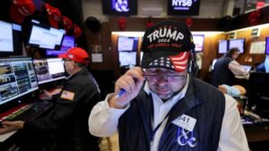 Một nhà giao dịch đội mũ ủng hộ ứng cử viên Cộng hòa Donald Trump...