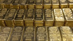 Những thỏi vàng nặng 1 kg được chụp tại nhà máy của nhà sản xuất...