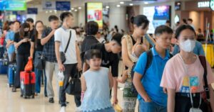 Hành khách xếp hàng làm thủ tục hàng không tại sân bay quốc tế Nội...