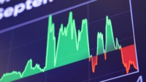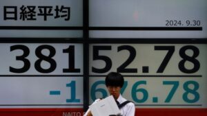 Một người qua đường đứng trước bảng điện tử hiển thị chỉ số chứng khoán...