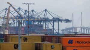 Các container vận chuyển tại Cảng Los Angeles ở Wilmington, California, Hoa Kỳ, vào ngày...