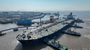 Ảnh chụp từ trên không cho thấy một tàu chở dầu thô tại một bến...