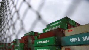 Các container xếp chồng lên nhau tại Portsmouth Marine Terminal (PMT) ở Portsmouth, Virginia, Hoa...