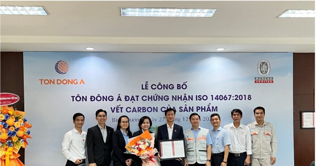 Ông Nguyễn Văn Đại – Phó tổng giám đốc Công ty Cổ phần Tôn Đông Á (đứng giữa) và ông Lâm Vĩnh Hảo – Giám đốc Chi nhánh Công ty Cổ phần Tôn Đông Á tại Thủ Dầu Một kiêm Giám đốc Khối sản xuất (đứng thứ 4 từ phải qua trái) vinh dự nhận chứng nhận ISO 14067:2018 từ đại diện Bureau Veritas Việt Nam