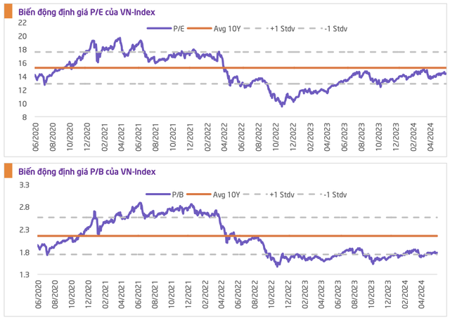 Xét về định giá, VN-Index hiện đang giao dịch tại mức P/E 14,4x. Mức định giá hiện tại vẫn còn hấp dẫn khi so với triển vọng phục hồi lợi nhuận của các doanh nghiệp trong năm nay và so với mức trung bình 10 năm là 15,2x. Định giá P/B của VN-Index hiện ở mức 1,8x và đang thấp hơn mức trung bình 10 năm là 2,2x.