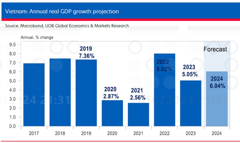 Song sự phục hồi của nhu cầu ngành bán dẫn, tăng trưởng ổn định ở Trung Quốc và khu vực Đông Nam Á cũng như khả năng nới lỏng chính sách tiền tệ của các ngân hàng trung ương lớn sẽ hỗ trợ cho triển vọng của Việt Nam. UOB giữ nguyên dự báo tăng trưởng của Việt Nam ở mức 6,0% cho năm 2024, so với mục tiêu tăng trưởng của Chính phủ là 6,0-6,5%.