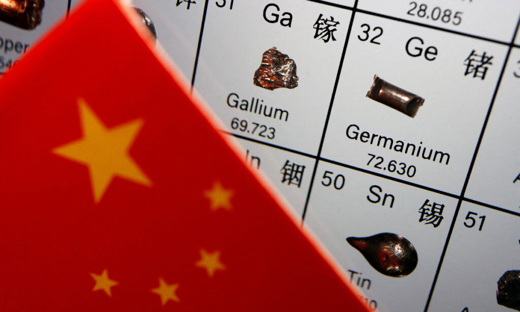 Cờ Trung Quốc cạnh các nguyên tố Gallium và Germaniumtrên bảng tuần hoàn. Ảnh: Reuters