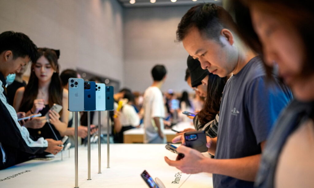 Khách hàng xem iPhone 15 Pro tại Apple Store Thượng Hải (Trung Quốc). Ảnh: Reuters