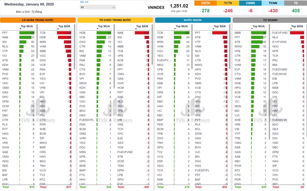 Phiên 8/1/2025 xét về cấu trúc dòng tiền toàn thị trường thì chưa có tích cực hơn mấy, thanh khoản hồi phục yếu NHƯNG lại tích cực về cách giao dịch, cụ thể như sau: