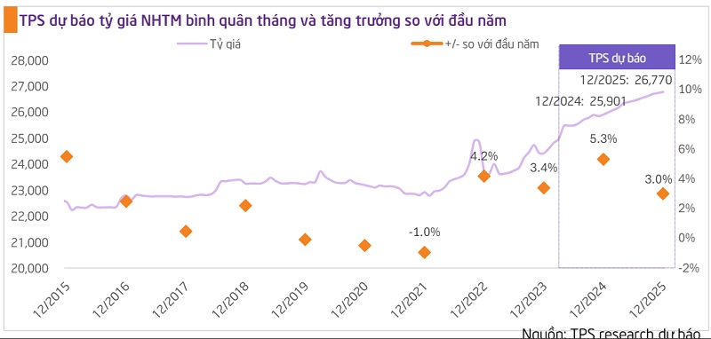 Theo kết quả mô hình dự báo ARIMA đơn biến của TPS, nếu duy trì như bối cạnh hiện tại, tỷ giá có thể tăng 5,3% tính từ đầu năm vào thời điểm cuối năm 2024. Tuy nhiên, nhóm phân tích của CTCK này cho rằng về cuối năm sẽ xuất hiện nhiều yếu tố thuận lợi hơn cho tỷ giá như: (1) Cán cân thương mại xuất siêu trở lại khi xuất khẩu tăng mạnh, (2) Hoa Kỳ cắt giảm lãi suất và nhiều quốc gia gia nhập BRICS làm cho đồng USD yếu hơn. Vì vậy, kỳ vọng tỷ giá NHTM có thể tăng khoảng 3% – 4% trong năm 2024.